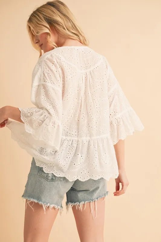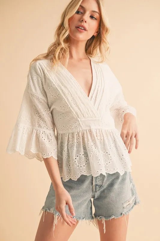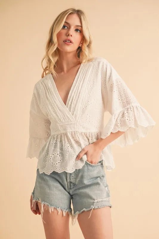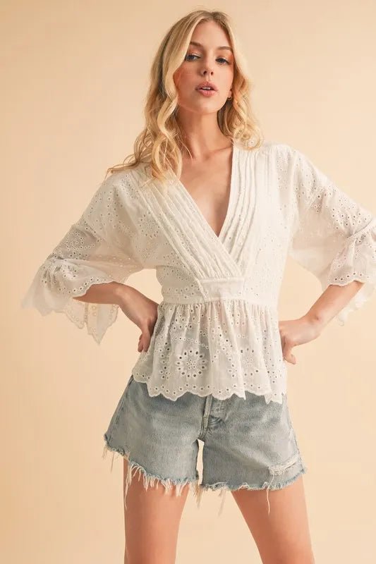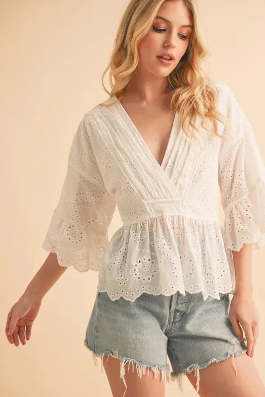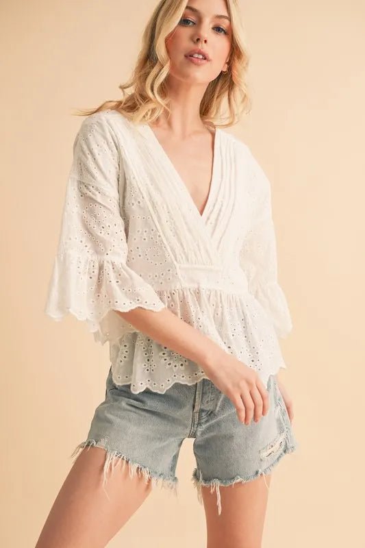 The Flounce Sleeve Eyelet Peplum Top is a charming blend of elegance and femininity, perfect for elevating any outfit. The flounce sleeves bring a touch of dramatic flair, while the delicate eyelet detailing adds texture and intricate beauty. Designed with a flattering peplum silhouette, this top creates a defined waistline for a polished, sophisticated look. Pair it with high-waisted pants or a skirt to achieve a chic, effortlessly stylish ensemble.
