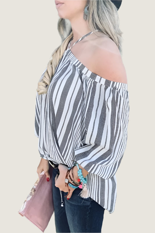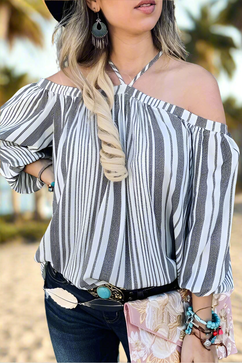 The Striped Cold Shoulder Halter Neck Top is a trendy and flirty piece that effortlessly combines style and comfort. Featuring a bold stripe print with chic cold shoulder cutouts, this top brings a touch of modern flair, while the halter neck silhouette elegantly highlights the shoulders and neckline. Perfect for warm summer days or fun nights out, it pairs beautifully with high-waisted jeans, shorts, or a flowy skirt for a casually chic look.