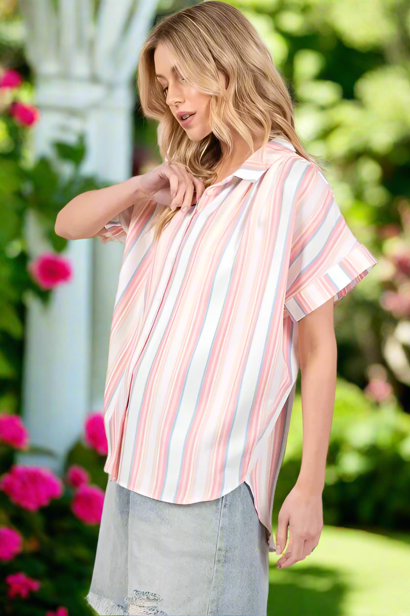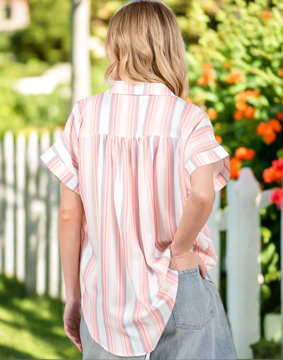 The Multi Stripe Button Down Short Sleeve Shirt is a perfect blend of casual style and polished elegance, featuring a vibrant multi-stripe pattern that adds a pop of color and personality to your outfit. The classic button-down closure provides a refined finish, while the short sleeves keep it light and comfortable, making it ideal for everyday wear. Whether paired with jeans for a relaxed look or styled with shorts for a sunny day out, this shirt offers a versatile, effortlessly chic option for any occasion.