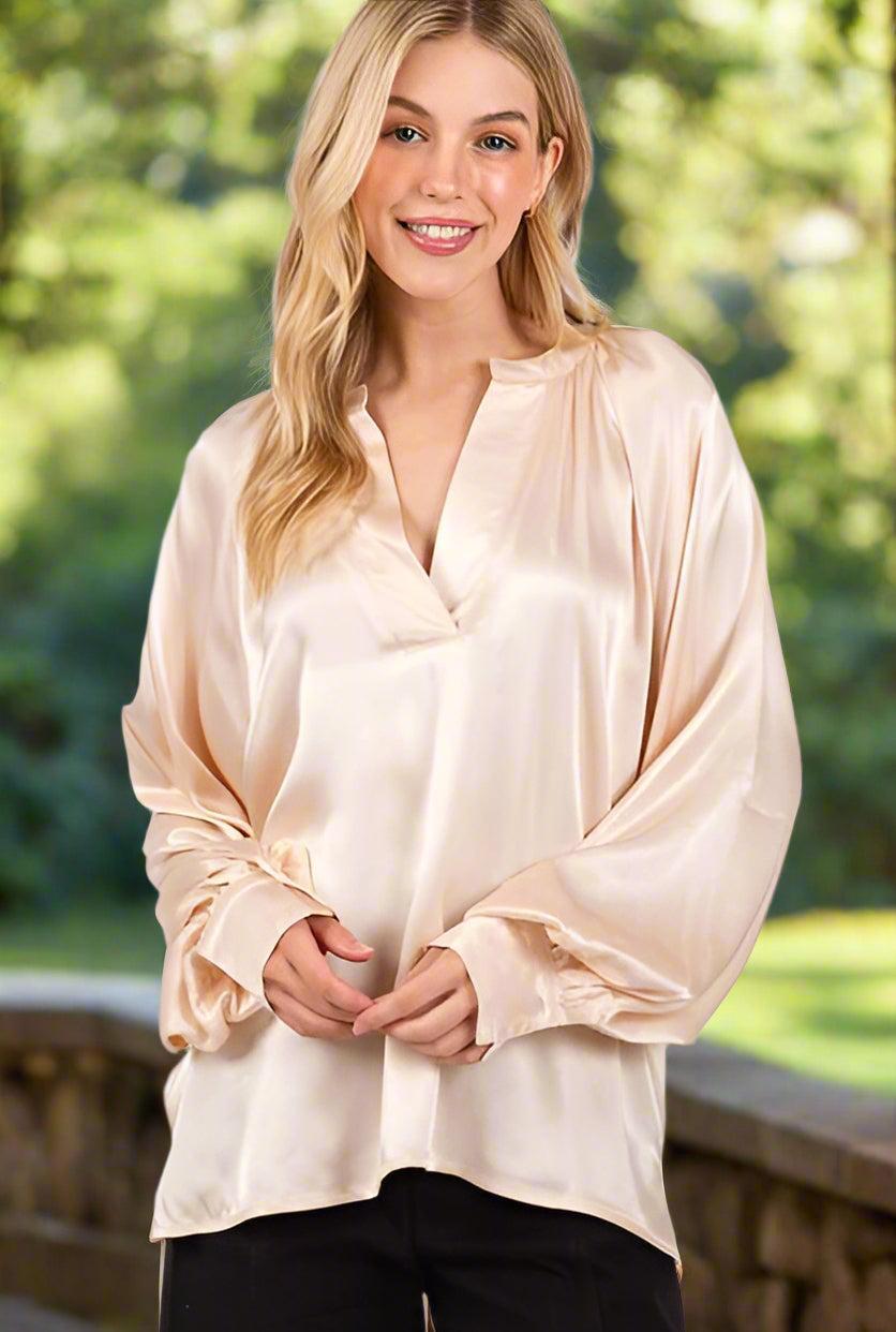 This viscose popover blouse features raglan long sleeves and a versatile design that can be dressed up or down. Its classic split neckline adds a touch of elegance to the relaxed fit, making it a perfect option for both casual and more formal occasions.