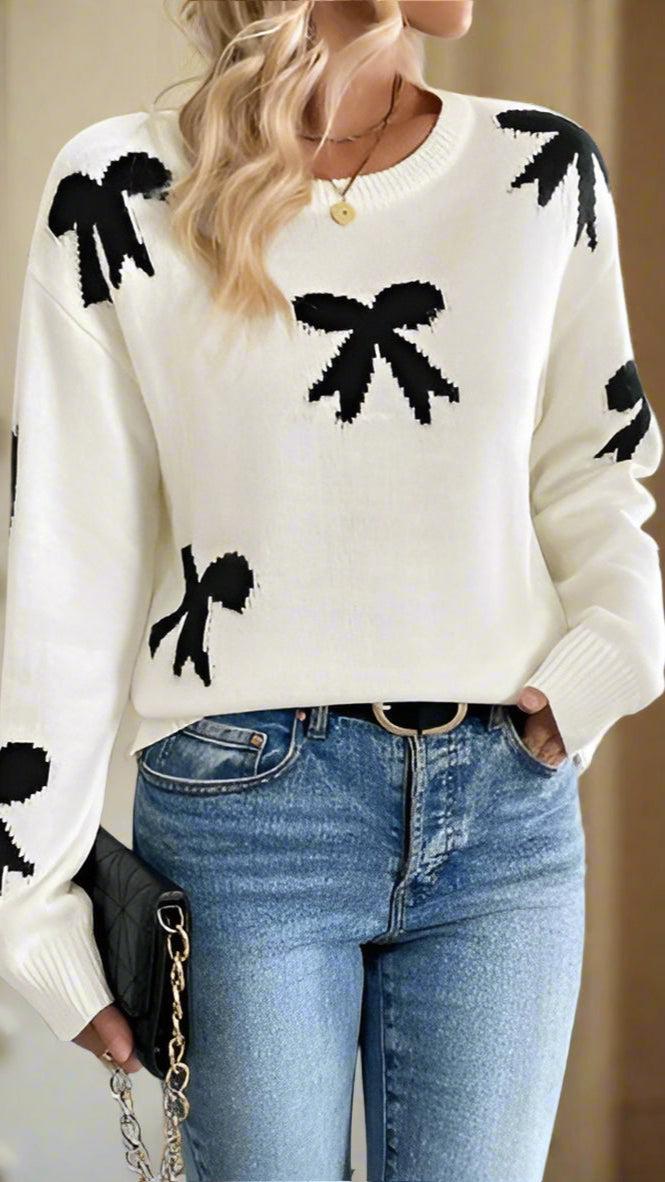 El suéter de manga larga con cuello redondo y estampado de lazo perfecto es una prenda divertida y femenina que le da un toque de encanto a cualquier look. Con un bonito lazo en la parte delantera, este acogedor suéter combina comodidad con un toque de fantasía. Su clásico cuello redondo y mangas largas lo convierten en una opción ideal para el día a día con vaqueros, faldas o leggings.