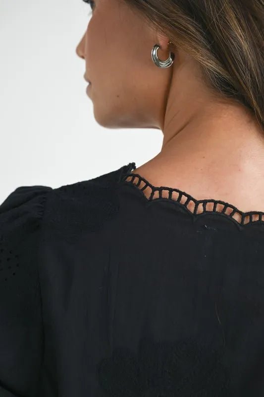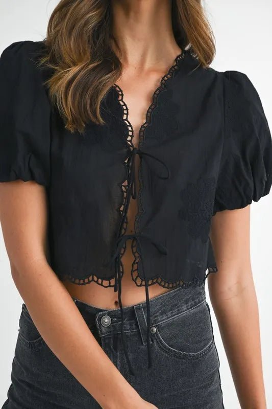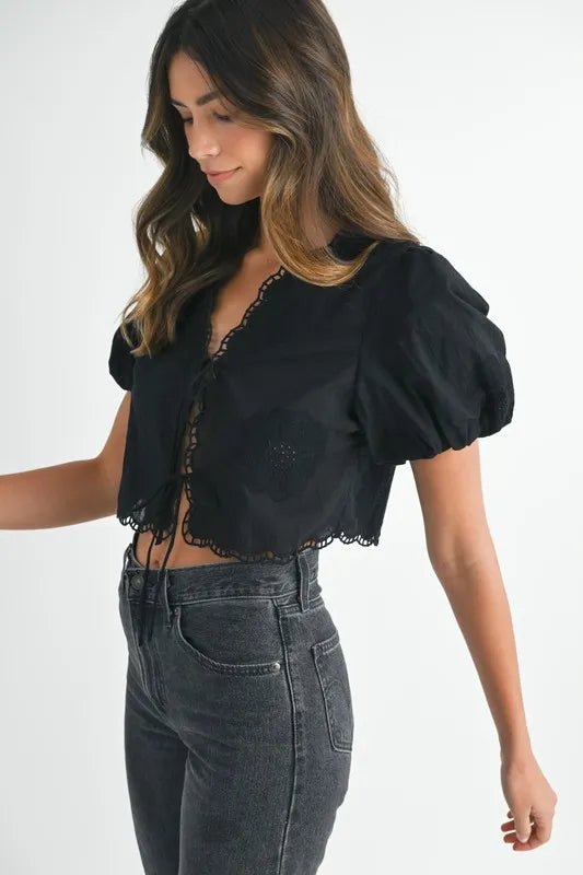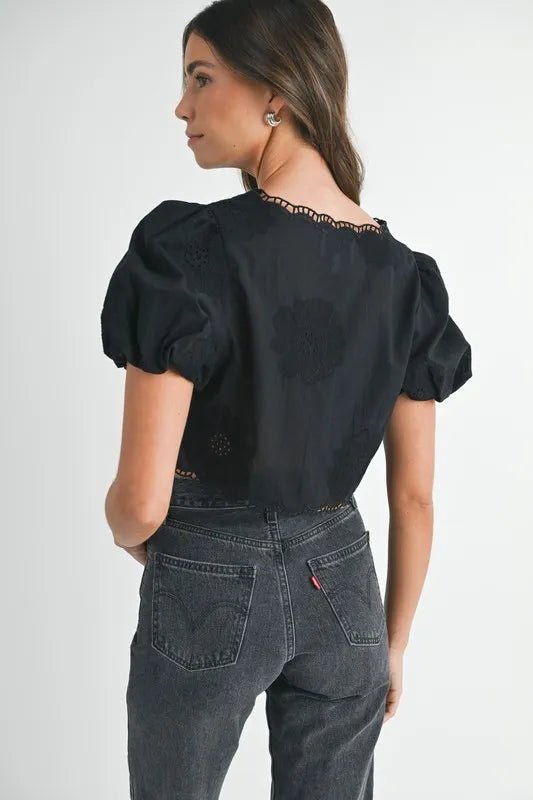 Top corto bordado con mangas cortas abullonadas